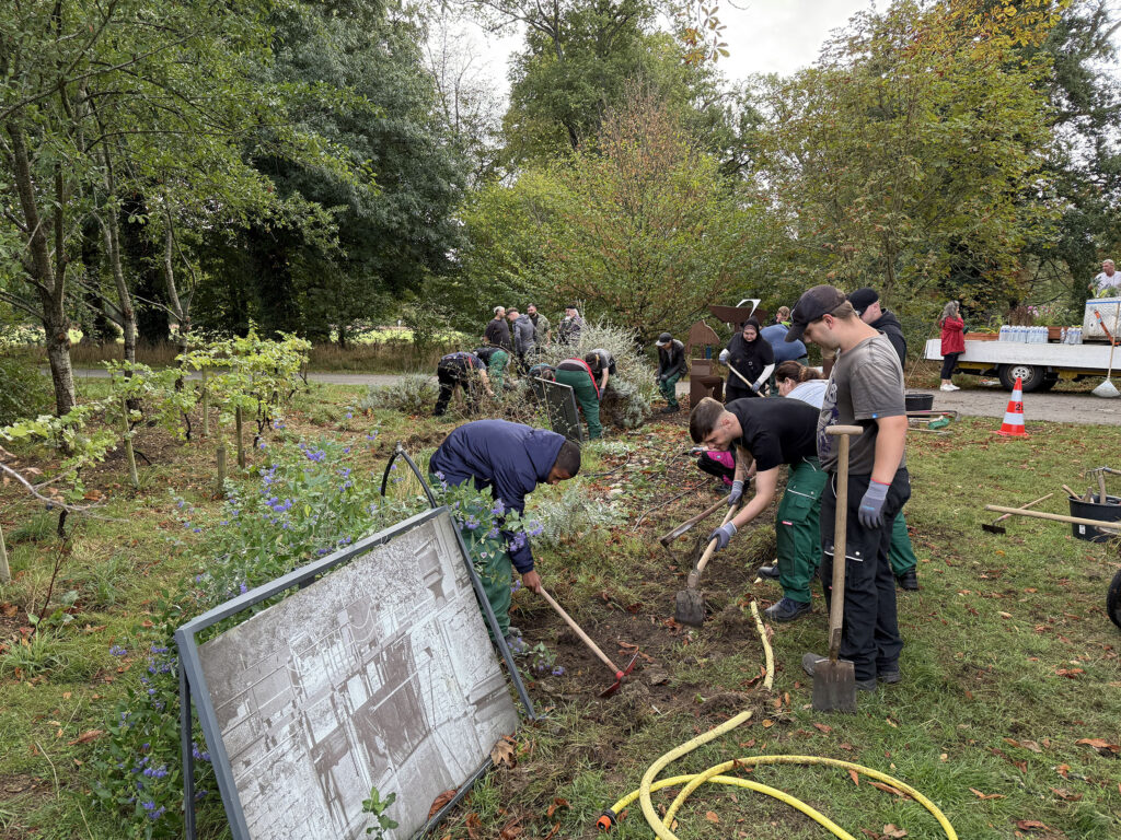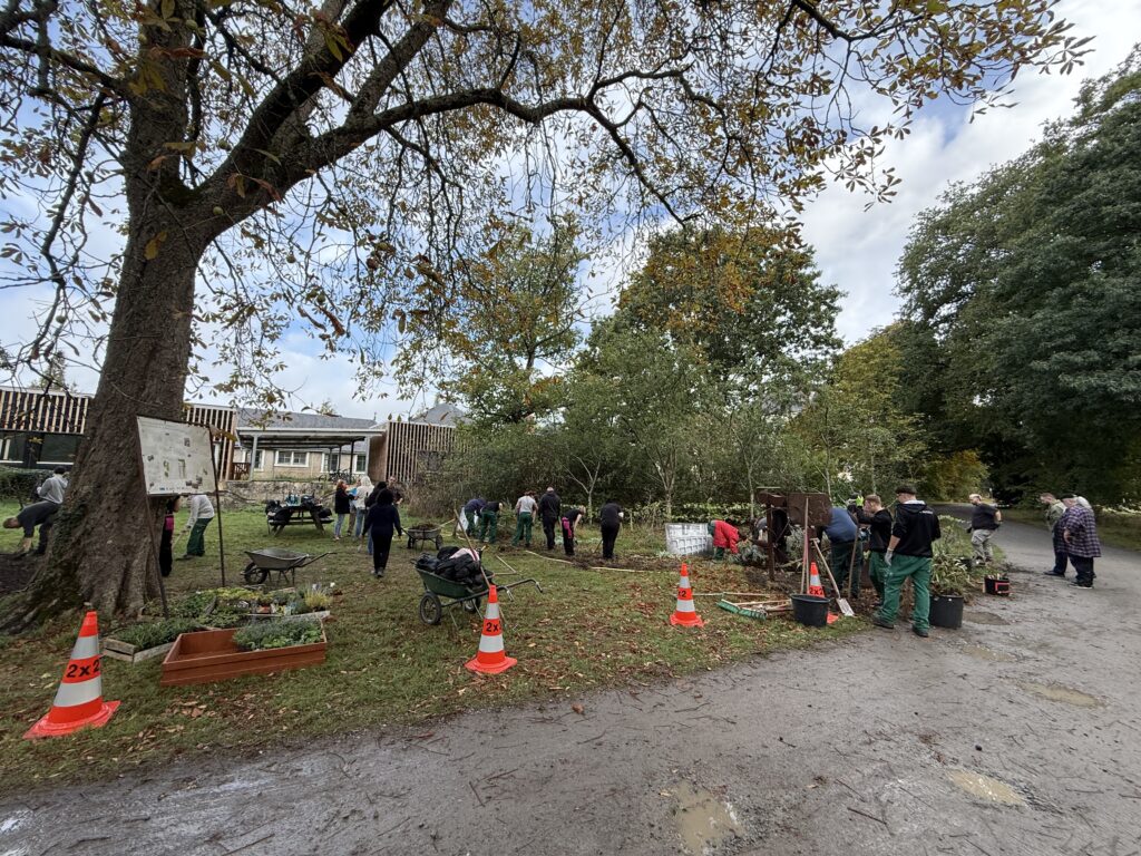 Les apprenants allemands de l’école ZBB de Sarrebruck, accompagnés de leurs formateurs viennent tous les 2 ou 3 ans pour entretenir et rénover le jardin franco-Allemand avec les élèves du lycée du Grand Blottereau.